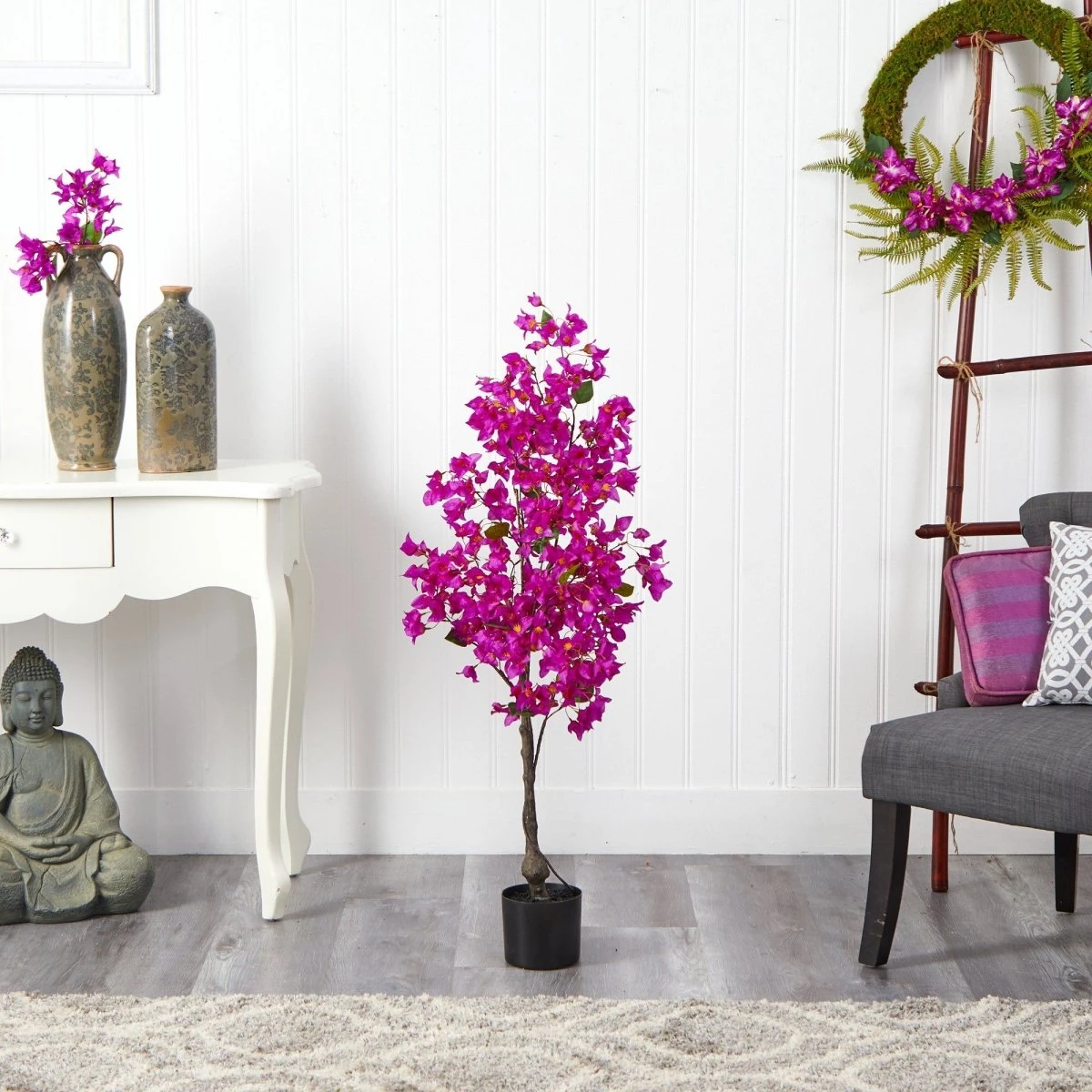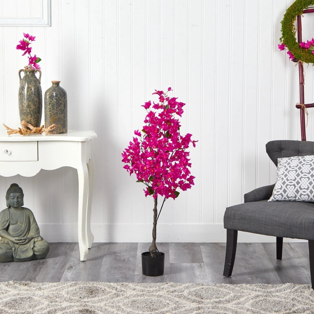 Bring a burst of color and life into your home with this 4’ Bougainvillea Artificial Tree. Featuring vivid pink flowers that cascade from a realistic brown trunk, this lifelike tree is inspired by nature and designed to brighten any space. Standing at 4 feet tall in a sturdy nursery planter, it’s a perfect statement piece for rooms that need a touch of elegance and vibrancy. Approved by horticulturists for its authentic appearance, this artificial tree effortlessly enhances spaces like bathrooms, kitchens, or home offices—anywhere that could use a little extra bloom.