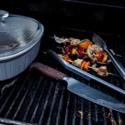 Ideal for cutting, dicing, slicing, and chopping, the Wilderness Chef Knife is an essential camp or outdoor cooking knife. The classic curved and tapered European blade makes this one of the most do-it-all, hard-working knives you’ll have in your cooking toolkit. Cut chunks of meat to throw on the grill, slice fruit for a picnic lunch, or chop fragrant herbs to toss in your dutch oven meal. Made with Aus 8 stainless steel, the 8-inch blade is easy to resharpen and maintain, holds its edge longer, and is resistant to chips and corrosion. Full Tang design allows for control and versatility, while the thicker spine is ideal for all-purpose cutting needs. Easy to use with a pinch grip or hammer. Durable composite rosewood handle offers a beautiful aesthetic with a comfortable grip. Included full-grain cow leather sheath weathers real-world use while protecting the blade from dulling.