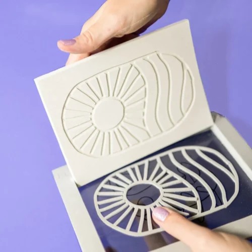 This project takes about one hour to complete. After your design is complete it will need two hours to set before it can be removed from molds. Each screen is about 5×7 inches. With two screens to craft with, this is a great activity to do with a friend!