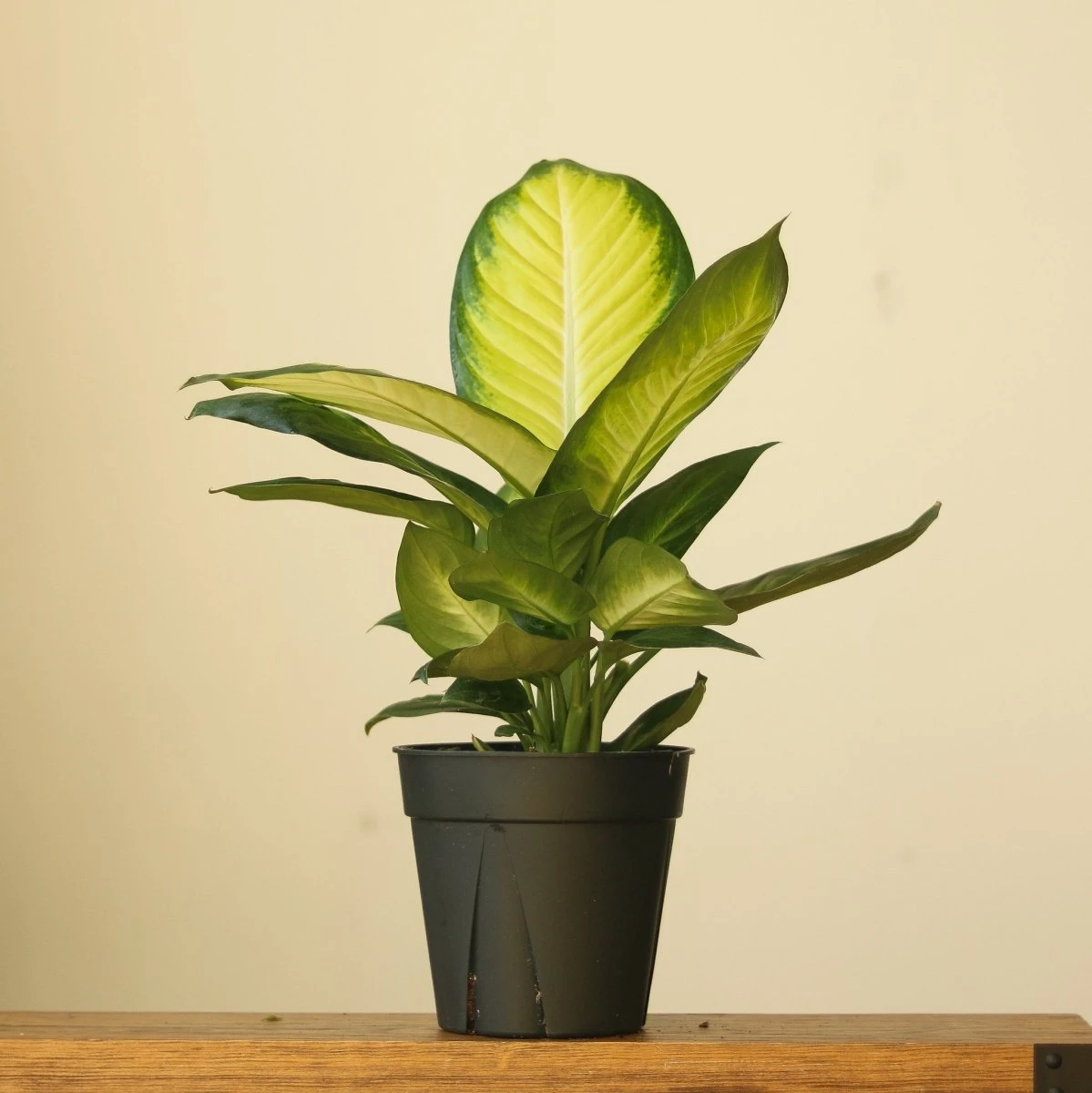 Dieffenbachia ‘Tropic Marianne’ (also called “Maryanne”) is prized for its upright, cane‑forming habit and boldly variegated leaves. Each glossy, lanceolate leaf bears a bright chartreuse central stripe fading into rich green margins, creating a dramatic architectural accent in any indoor setting.