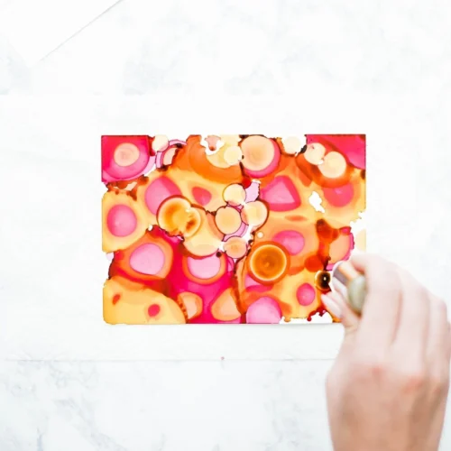 This project takes about an hour to complete. Alcohol inks are fast-drying, permanent dye inks specially formulated to produce vibrant and polished pieces. With plenty of yupo paper to share, this project is great to do with a friend!Â