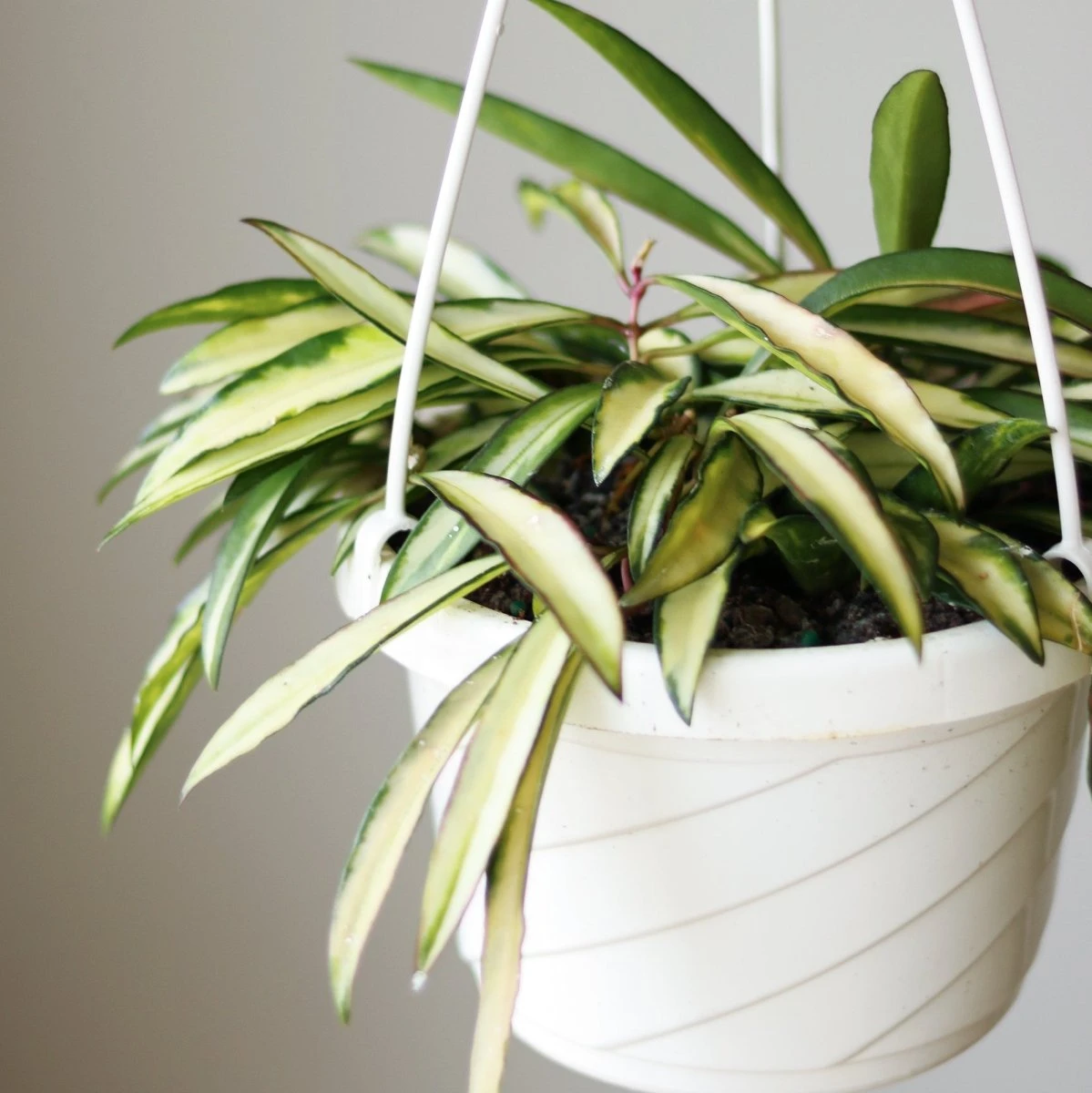 - Waxy, Star-Shaped Blooms: Mature plants may produce umbels of small, sweetly fragrant, star-like flowers in soft pink and maroon hues, typical of the Hoya genus.