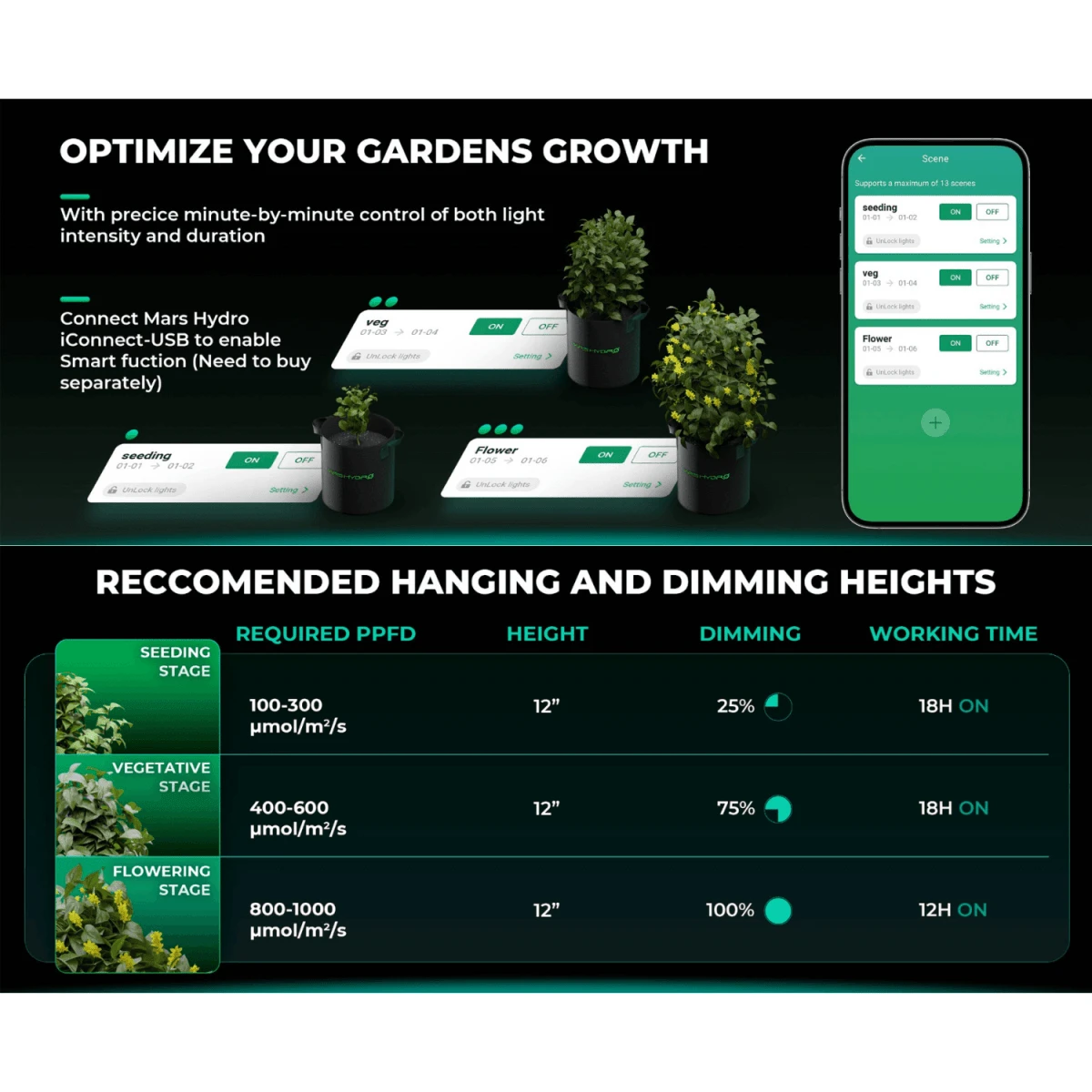 - Smart Controls: Use the Mars Hydro APP for wireless dimming, scheduling, and remote management of the grow light.