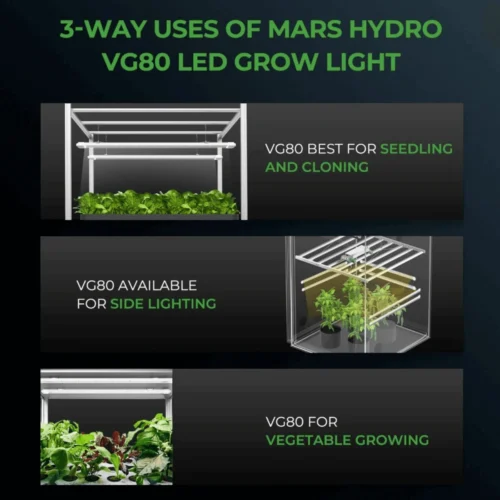 Elevate your indoor garden with the Mars Hydro VG80, a high-efficiency 80W LED grow light bar designed for seedlings, clones, propagation, leafy greens, and tropical houseplants. Its slim, waterproof design and full-spectrum output make it a powerful and adaptable solution for shelf growing, racks, or small tents.