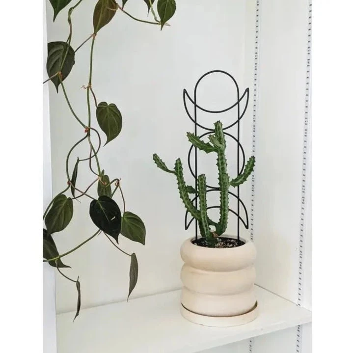 Introducing our Metal Moon Phase Trellis. A versatile and stylish addition to your indoor and outdoor spaces. This unique trellis is perfect for your climbing & trailing plants providing a charming display for pots 4″ and larger. Crafted with precision from durable powder-coated metal, this crescent moon-shaped trellis is built to last. Its sturdy construction ensures stability for your plants, offering a reliable platform for showcasing your green companions. Made for Indoor & Outdoor use.