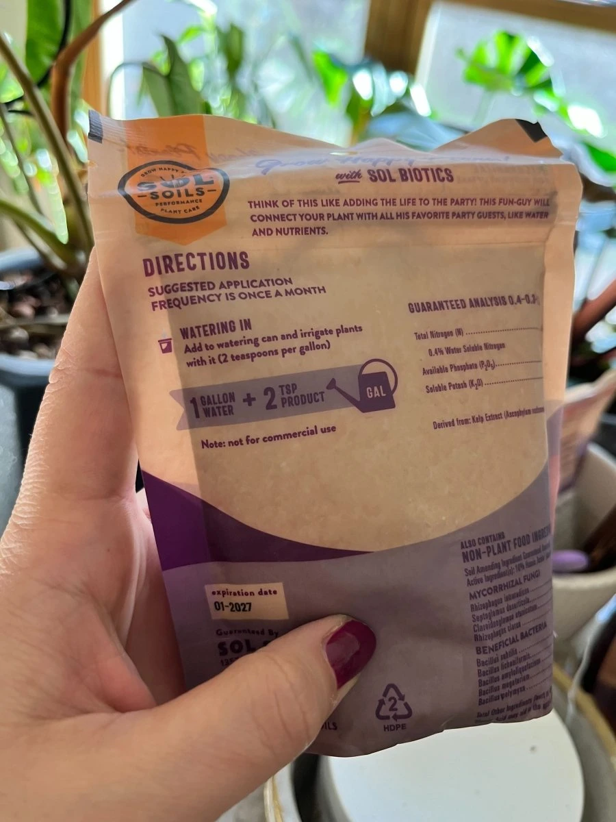 - Watering In: Mix 1–3 tsp per gallon of water (scoop included) and apply to soil at the base of plants.