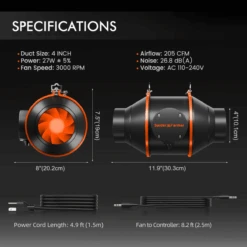 - Includes 4″ inline fan, carbon filter, flex aluminum ducting, and hose clamps.