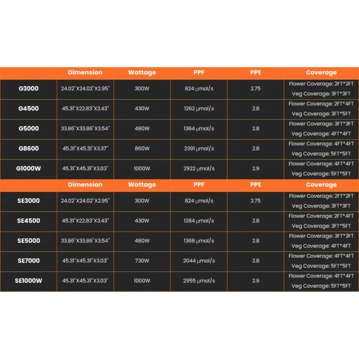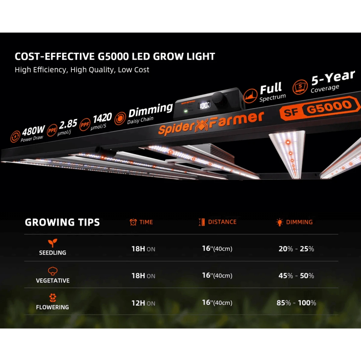 With an impressive PPE of 2.85 µmol/J and a power draw of 480W, the G5000 maximizes returns on energy investment while reducing heat output for simplified temperature control.