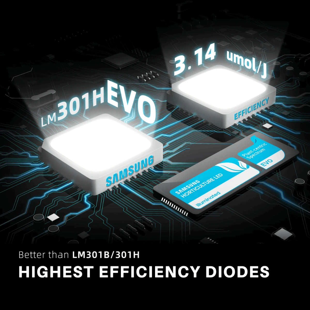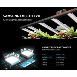 The Spider Farmer SE5000 delivers professional-grade lighting with advanced Samsung LM301H EVO diodes for enhanced plant growth and higher yields. This energy-efficient LED grow light is perfect for 3’x3′ to 4’x4′ coverage areas, ensuring consistent, even light distribution. Its full spectrum design supports plants through all growth stages, while efficient cooling and daisy chain dimming features make it ideal for both personal and commercial setups.
