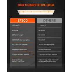 Grow smarter with the Spider Farmer SF300, a compact, full-spectrum LED grow light engineered for vigorous vegetative growth. Using 192 Osram diodes, it delivers 75 µmol/s PPF with just 33 watts, making it ideal for seedlings, clones, and leafy greens.