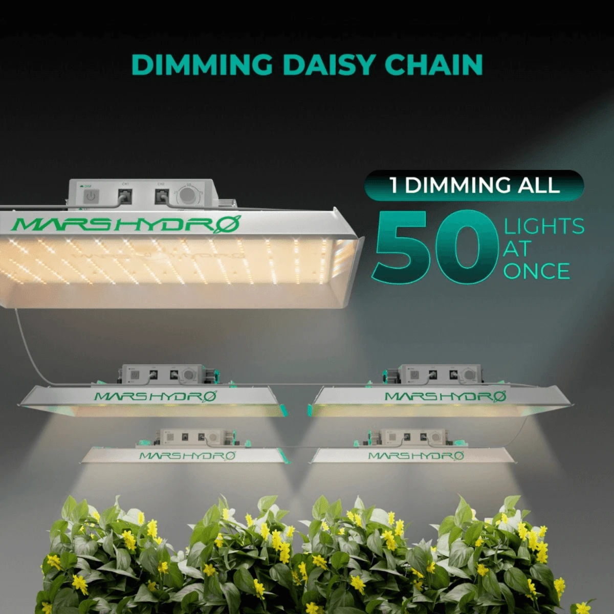 Featuring a dimming knob and daisy chain functionality, you can adjust the light intensity from 0–100% and connect up to 30 lights, optimizing energy use and coverage for all plant stages.